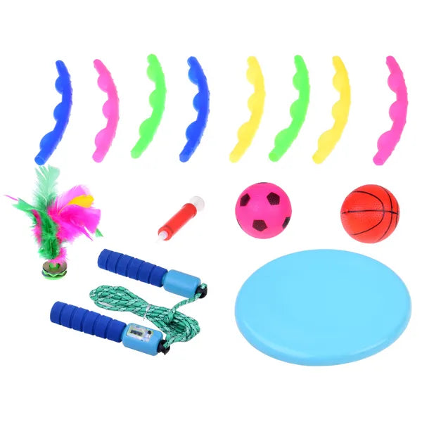 5-az-1-ben gyerek sportkészlet hulahopp, ugrálókötél, frizbi, labda, tollas