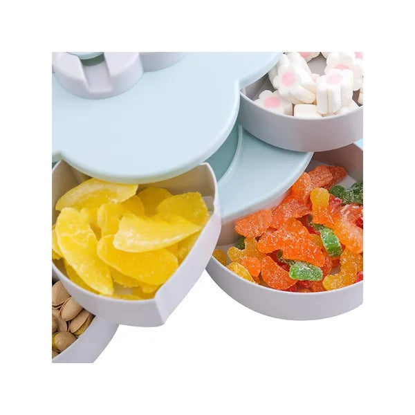 A virágszirom alakú, forgatható tároló öt külön rekesszel rendelkezik, így egyszerre kínálhatsz többféle ropogtatnivalót, vagy rendszerezheted ékszereidet és apróságaidat. A felső forgógomb egy mozdulattal nyitja-zárja a dobozt, s stabil telefonállványként is szolgál, hogy filmnézés közben kényelmesen falatozhass.