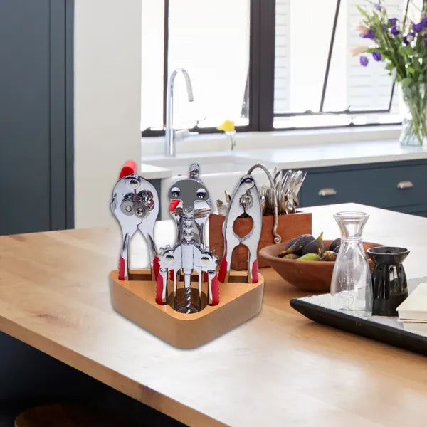 Az 5 részes konyhai eszközkészlet ideális megoldás, ha elegáns, mégis praktikus kiegészítőt keresel a mindennapi főzéshez. A rozsdamentes acélból készült dugóhúzó, diótörő, fokhagymanyomó és konzervnyitó egy mutatós, kompakt fa állványon kapott helyet, így a munkapult mindig rendezett marad.