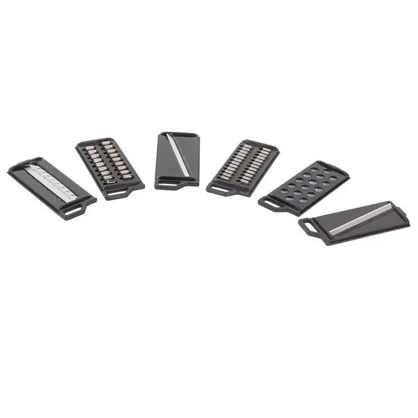 - 6 cserélhető penge: vékony és vastag csík, 1,5 mm és 2 mm szeletelő, reszelő, hullámosító