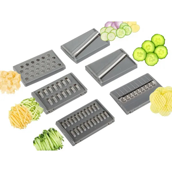 Főbb előnyök- 6 cserélhető, rozsdamentes acél penge: finom reszelő, 3 mm julienne, 5 mm kocka, vékony (2 mm) és vastag (3 mm) szelet, hullámos korong.