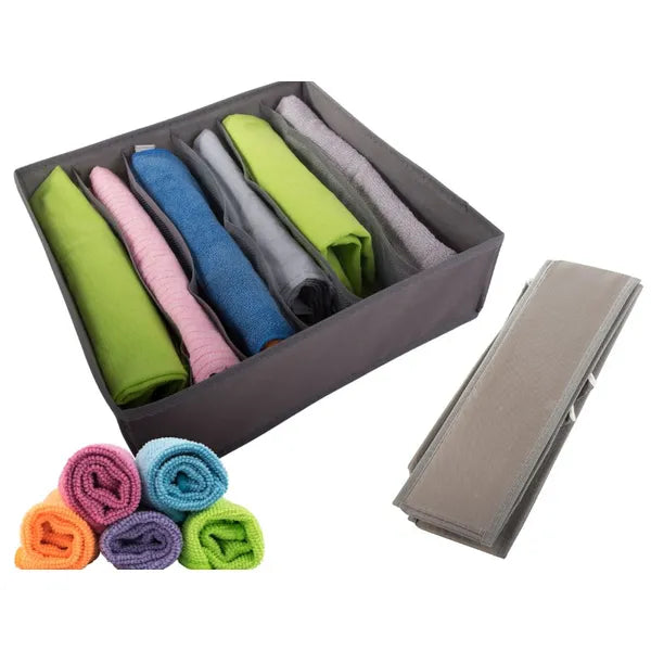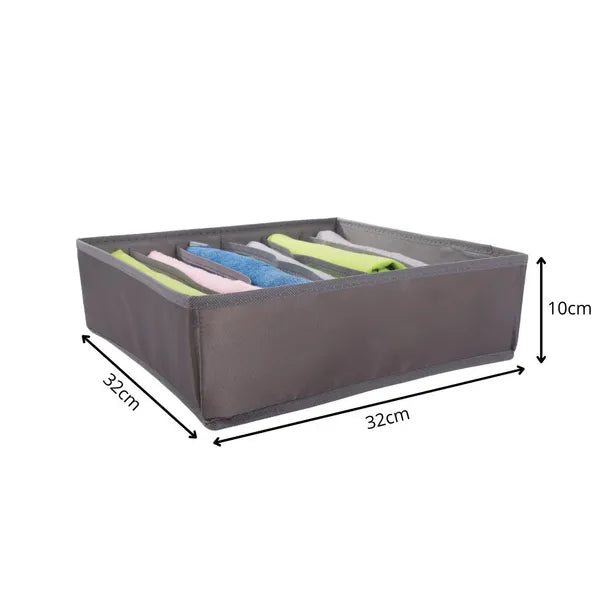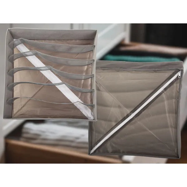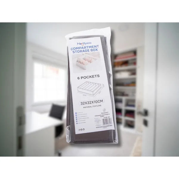 A 6 rekeszes melltartó- és fehérneműrendező segít, hogy fiókjaidban és szekrényeidben végre átlátható rend uralkodjon. A 32×32×10 cm-es, szürke, poliészter tároló elegáns megjelenést kölcsönöz, miközben hatékonyan kihasználja a rendelkezésre álló teret.