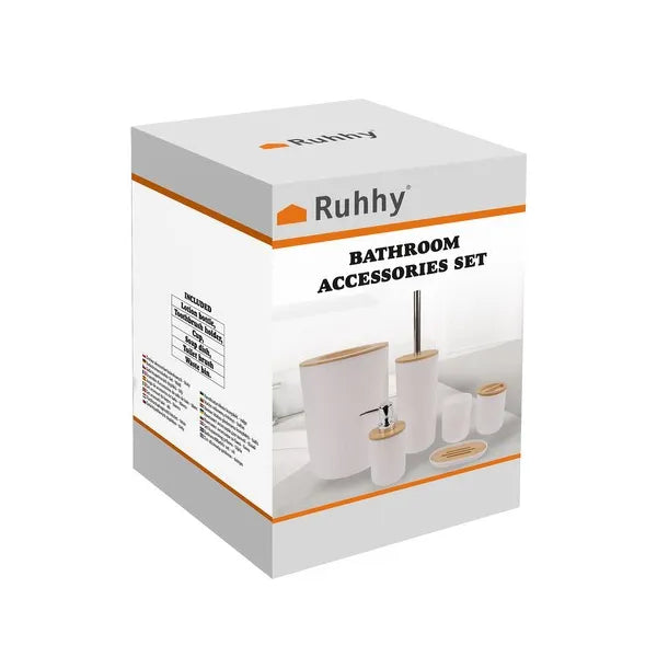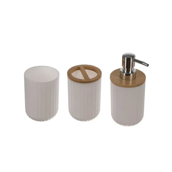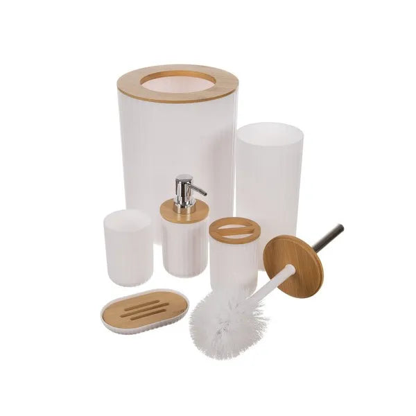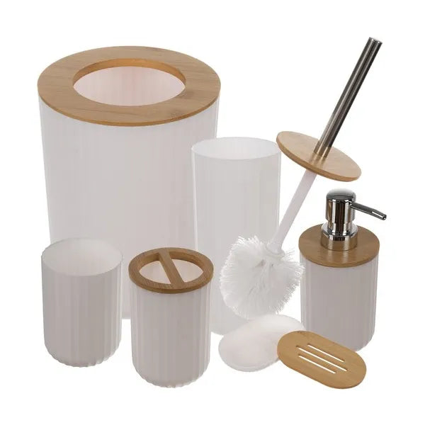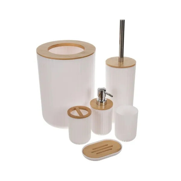 Ez a 6 részes, bordázott felületű fürdőszobai kiegészítő szett fehér PP műanyagból és természetes bambusz elemekből készült, így egyszerre biztosít modern megjelenést és hosszú élettartamot.