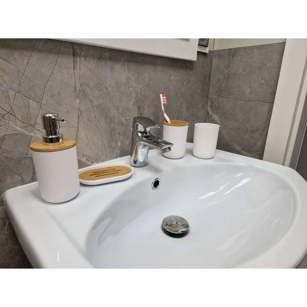 6 részes fehér fürdőszobai szett WC kefével, adagolóval, szemetes, műanyag