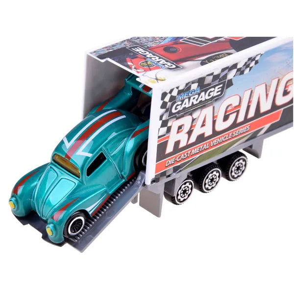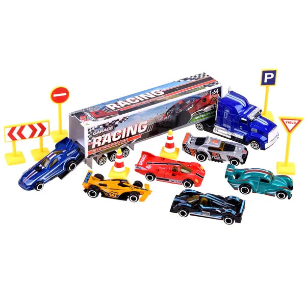 A 7 darabos, részletgazdagon kidolgozott fém kisautó készlet azonnal versenypályává varázsolja a gyerekszobát. A sportkocsik fém karosszériája és a műanyag alváz tartóssá teszi a játékot, míg a nagyméretű kamion lehajtható rámpával és zárható ajtóval gondoskodik a szállítás élményéről.