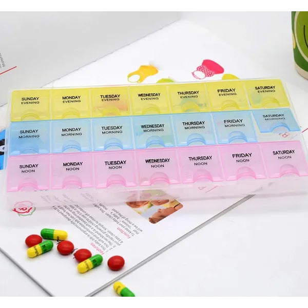 7 napos gyógyszeradagoló doboz, napi 3 rekesszel, PP, többszínű, 21,5×9,3×2,3 cm