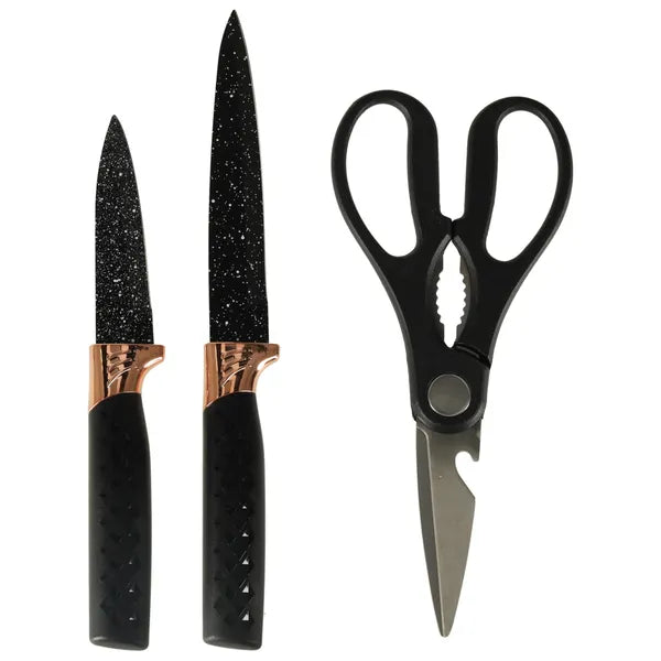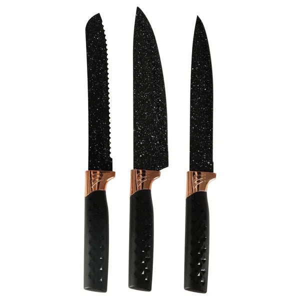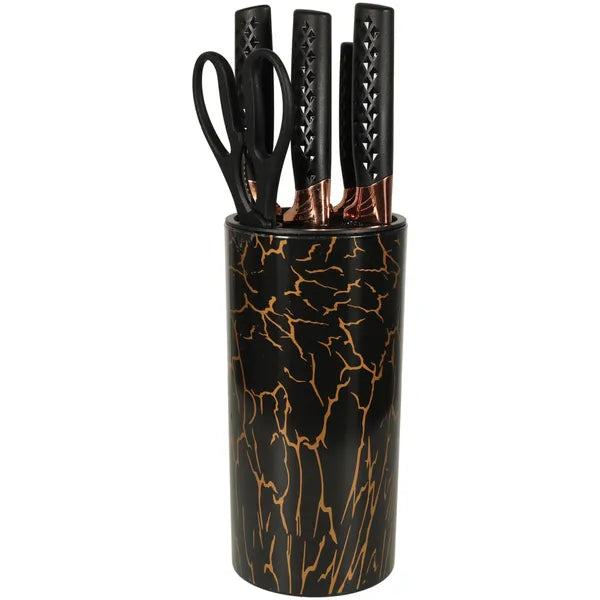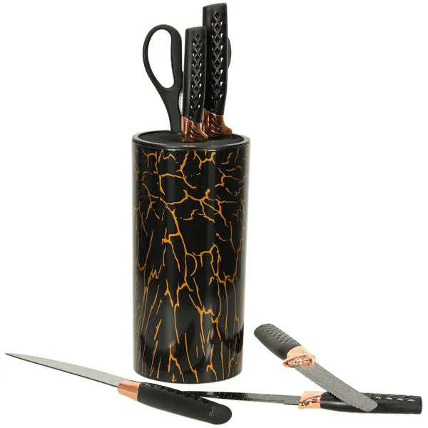 A kompakt állvány rendezetten és biztonságosan tartja a késeket, így mindig kéznél lesznek. A rozsdamentes pengék minimális erőfeszítéssel siklanak át a húsokon, zöldségeken és pékárun, a márványhatás pedig modern, elegáns megjelenést ad konyhájának. Használja ki a kedvező árat, és élvezze a profi vágási élményt otthonában!