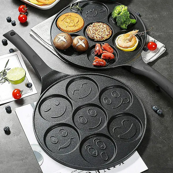 Masszív, lapos serpenyő tojások és mini palacsinták készítéséhez. Egyidejűleg akár 7 darabot süthetsz; a mélyedések mosolygós mintái vidámabbá teszik a tálalást.