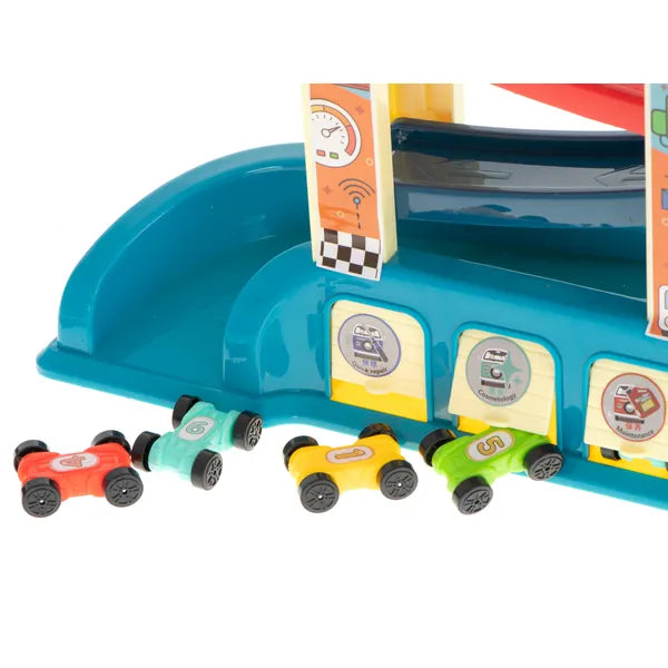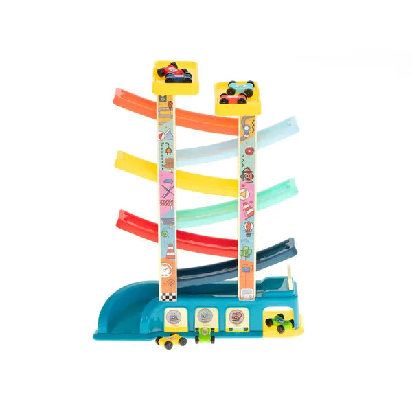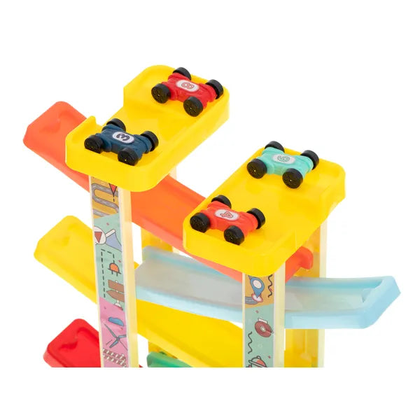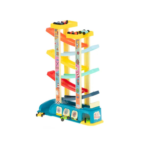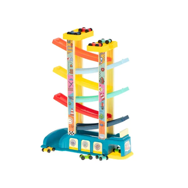 A hét szintben kanyargó, színes csúszdapálya azonnal versenypályává varázsolja a gyerekszobát. A mellékelt nyolc kisautó nagy sebességgel ugrik egyik rámpáról a másikra, látványos mozdulatokkal érkezve a földszinti garázsba.