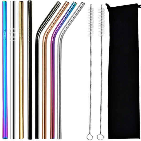 8 darabos rozsdamentes acél szívószál készlet, 4 egyenes + 4 hajlított, kefékkel