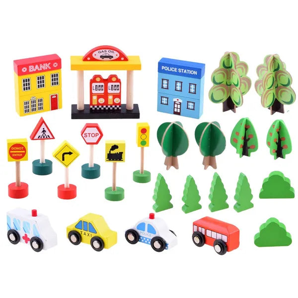 - Komplex készlet – 30 sínrész, vasúti átjáró, épületek, járművek, emberek és állatok.