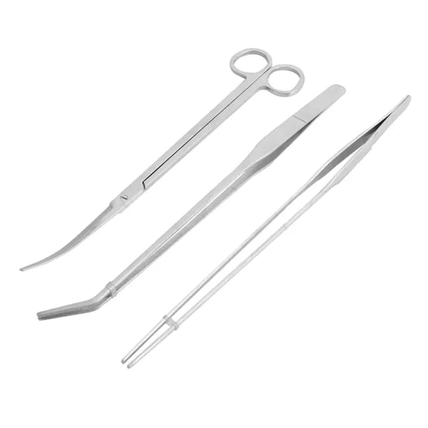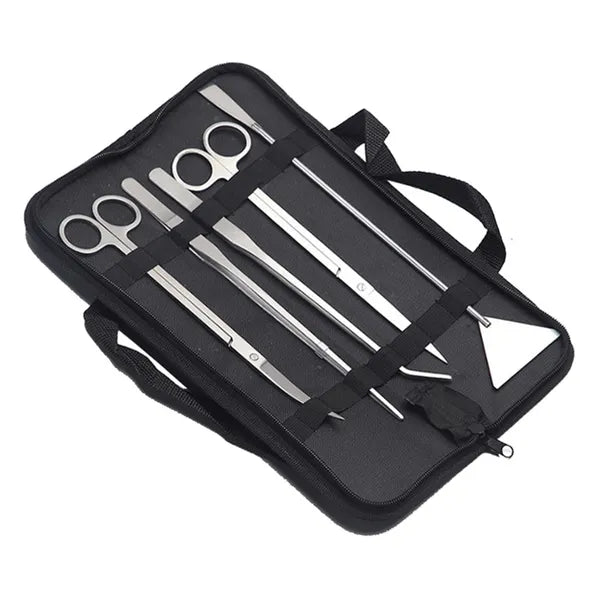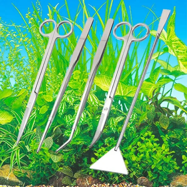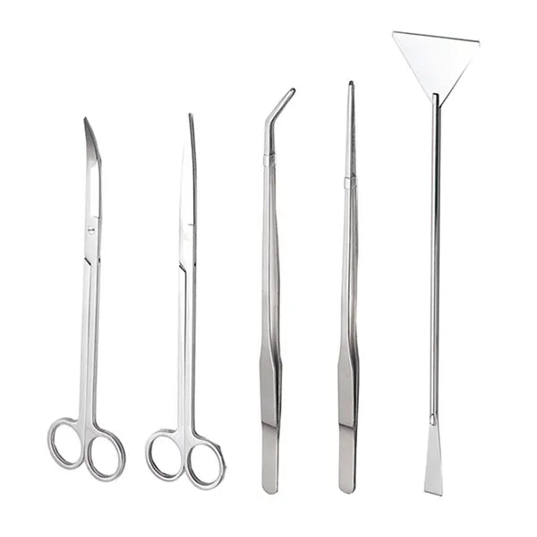 Praktikus, 5 darabos készlet az akvárium ápolásához és akvakertészkedéshez: csipeszek, ollók és lapátka a növények metszéséhez, ültetéséhez és a talaj rendezéséhez. Az eszközök tartós, rozsdamentes acélból készültek, a rendezett tárolást pedig cipzáras tok segíti.