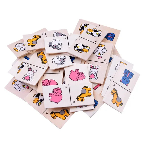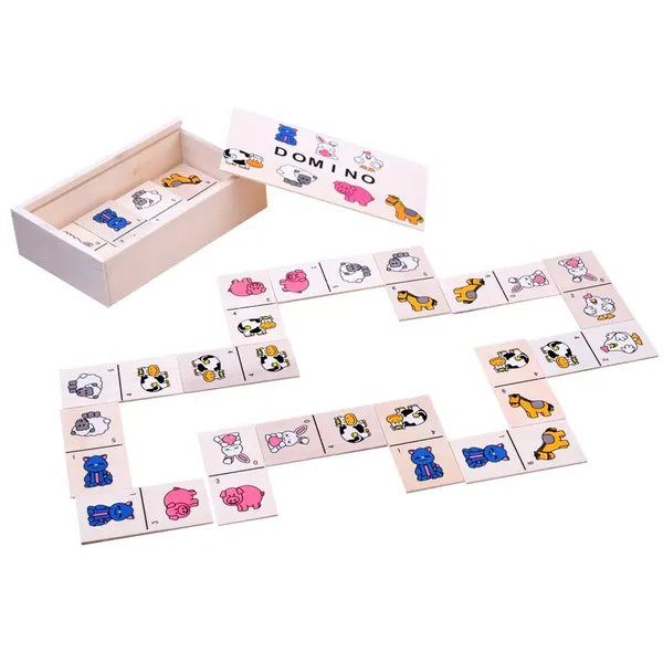 Állatos képes dominó gyerekeknek, 28 fa lapka fadobozban