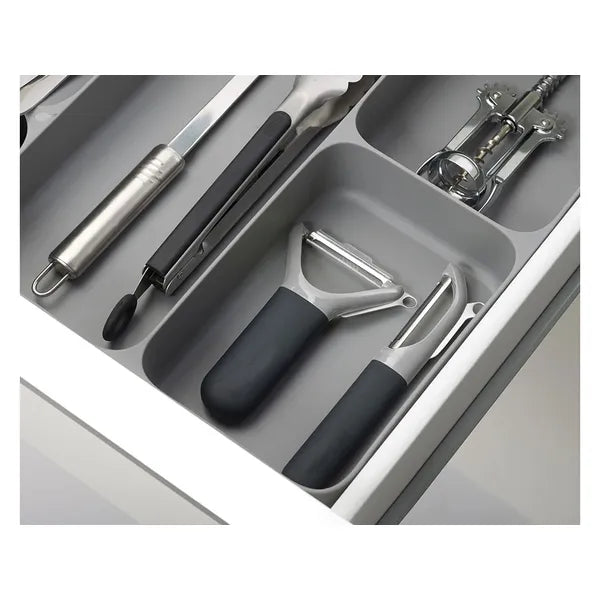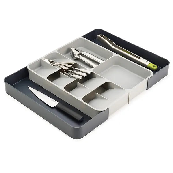 Az állítható evőeszköz rendező segítségével végre átláthatóvá válik a konyhafiókod: minden kés, villa és kanál saját rekeszben kap helyet, így gyorsabban és higiénikusabban dolgozhatsz.