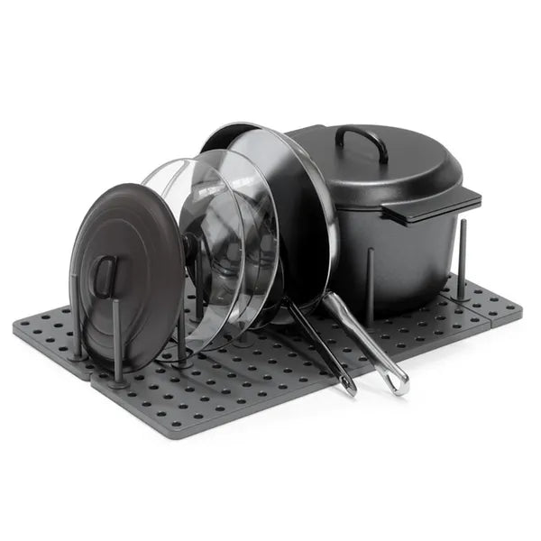 Szüntesd meg a kaotikus fiókokat, és alakítsd saját igényeidhez a konyhateret ezzel az okos, kihúzható fiókbetéttel. A furat-és-csap elrendezésű alapon szabadon áthelyezheted a támasztó pálcákat, így fazekakat, serpenyőfedőket, műanyag ételtárolókat vagy akár tányérokat is stabilan rögzíthetsz.