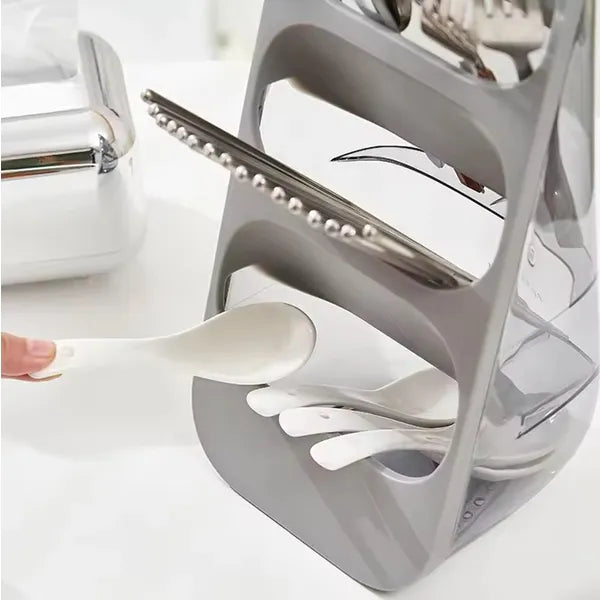 Álló evőeszköz csepegtető, 3 szintes, PP, 33,5×16×13 cm, szürke/átlátszó