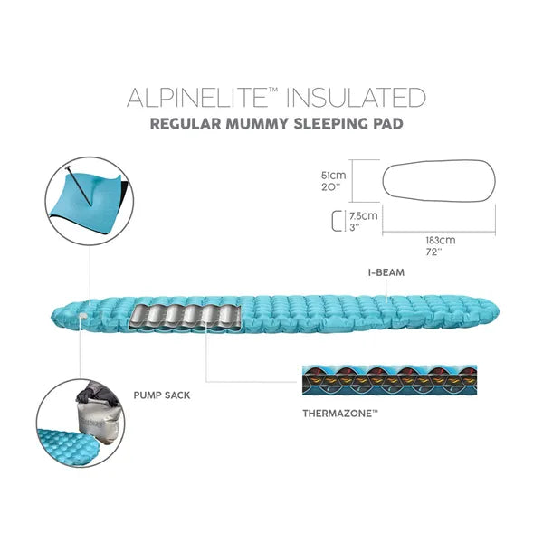 Az AlpineLite Insulated Regular Mummy felfújható túramatrac a meleg, kényelmes alvóhely titka a hegytetőn vagy a tóparton. Csupán néhány pumpálás az AirCinch zsákkal, és a 7,3-as R-értékű kétoldali alumíniumfólia máris hatékonyan visszaveri a testhőt a -20 °C alatti éjszakákon is.