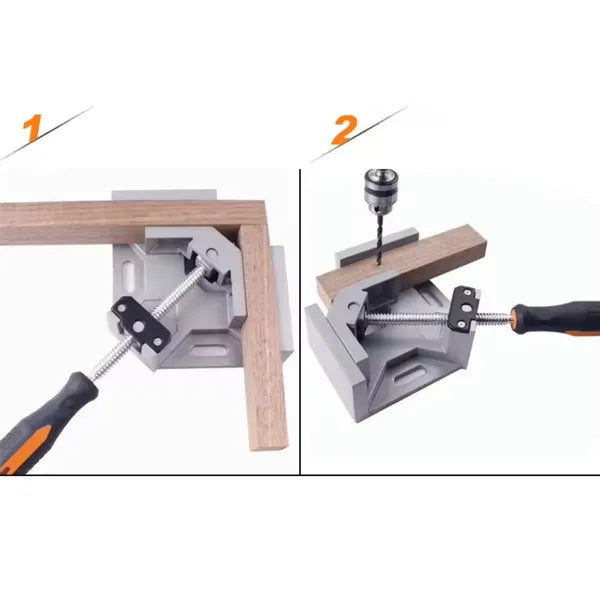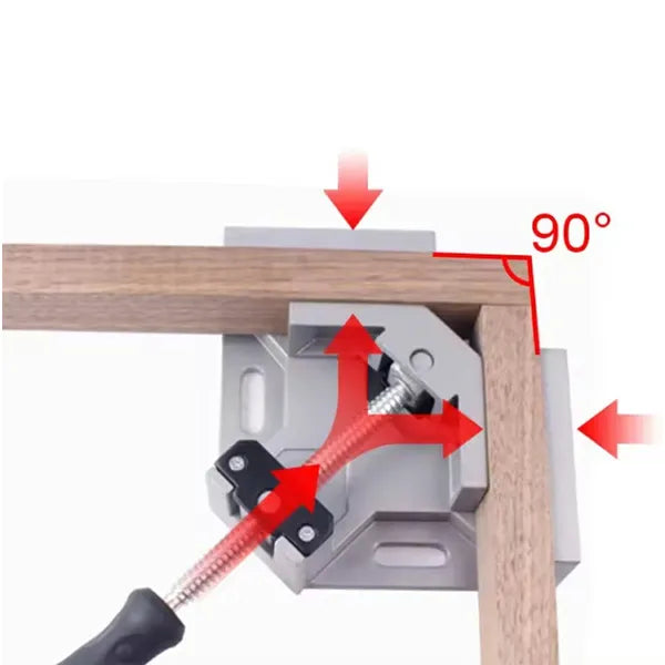 Masszív, fémből készült asztalos sarokszorító derékszögű (90°) illesztésekhez. Megbízhatóan tartja a munkadarabokat, így a sarkok pontosan és merőlegesen állnak a ragasztás vagy csavarozás ideje alatt.