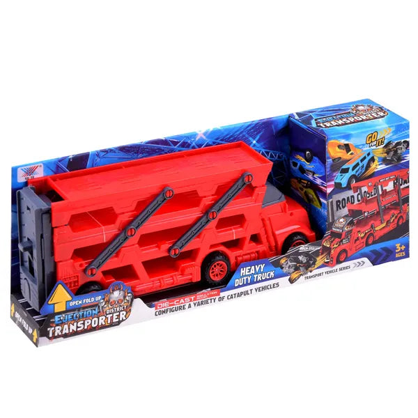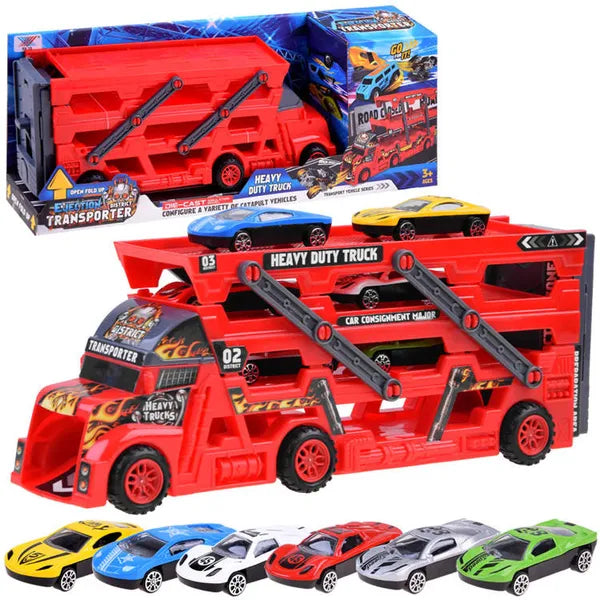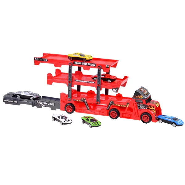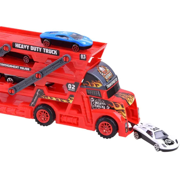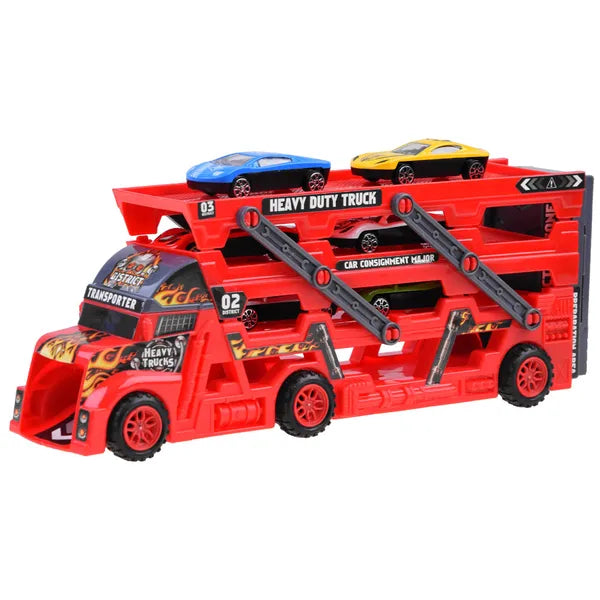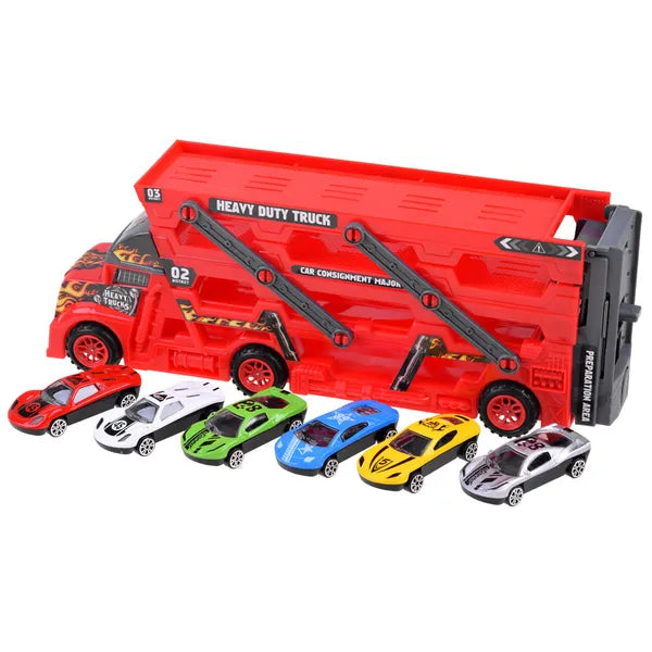 Autószállító kamion, 30 cm, 3 szintes tréler, 6 fém versenyautóval
