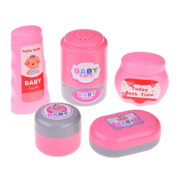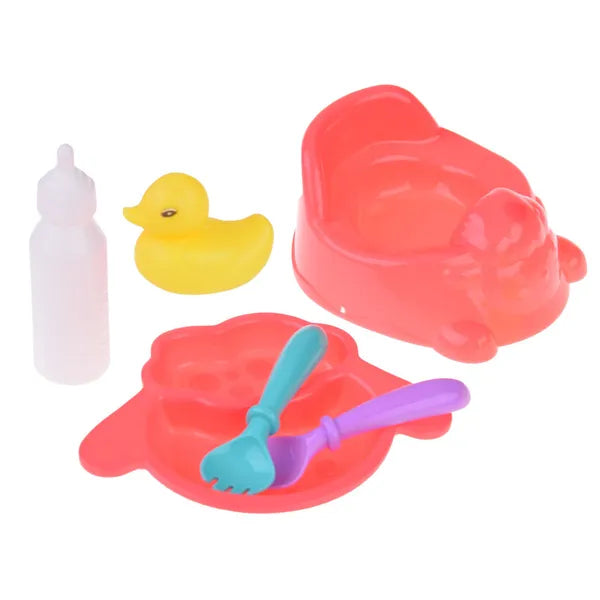 Baba- és babázó kiegészítő készlet bilivel, etető- és fürdető kellékekkel, 15 db