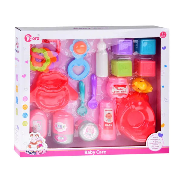 A 15 részes baba-kiegészítő készlet mindent tartalmaz, amire a kis szülőknek szüksége lehet a babázáshoz: a biliztetéstől kezdve az etetésen át egészen a fürdetésig. A színes műanyag darabok biztonságosan használhatók, serkentik a szerepjátékot, fejlesztik a finommotorikát és az empatikus készségeket.