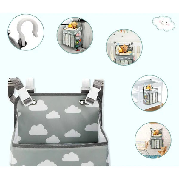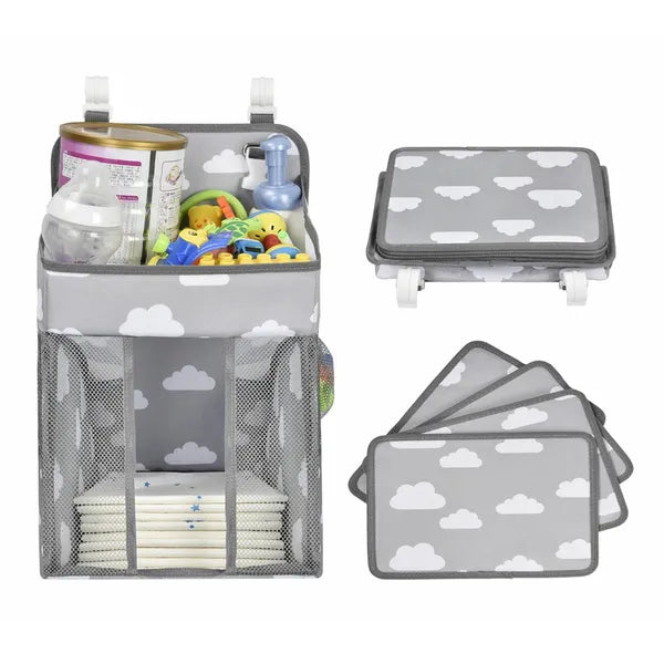 Praktikus, babaágyra akasztható szervező, amely egy helyen tartja a pelenkázáshoz és altatáshoz szükséges kellékeket. Az erős akasztók segítségével könnyen feltehető a kiságy peremére, így minden kéznél van éjszaka is.