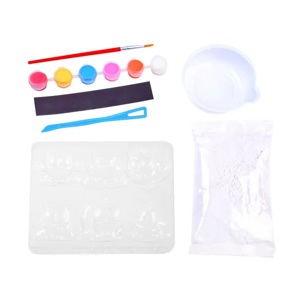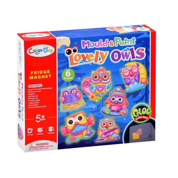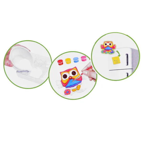 Adj szárnyakat a gyerek képzeletének ezzel a tündéri bagoly hűtőmágnes készítő szettel! A csomagban található gipszport vízzel keverve hat bájos öntőforma tölthető ki, amelyeket a száradás után a mellékelt festékekkel lehet színezni, végül a mágnescsík felragasztásával használatba venni.