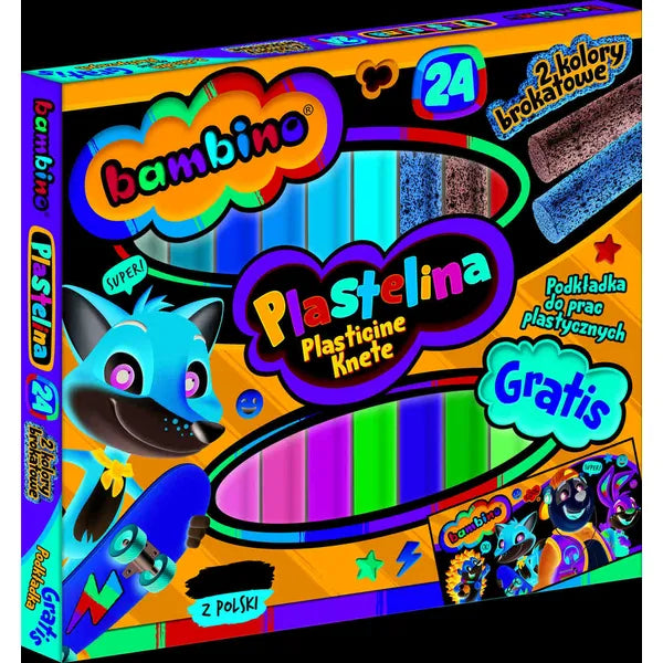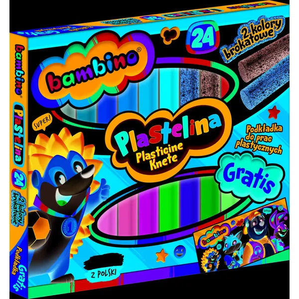 A Bambino gyurma készlet 24 különböző, intenzív színű rudat tartalmaz, köztük arany és ezüst csillámos árnyalatokat. A rugalmas anyag könnyen formálható, nem tapad az asztalhoz és nem hagy foltot a kézen, így ideális otthoni és óvodai kézműves foglalkozásokhoz.