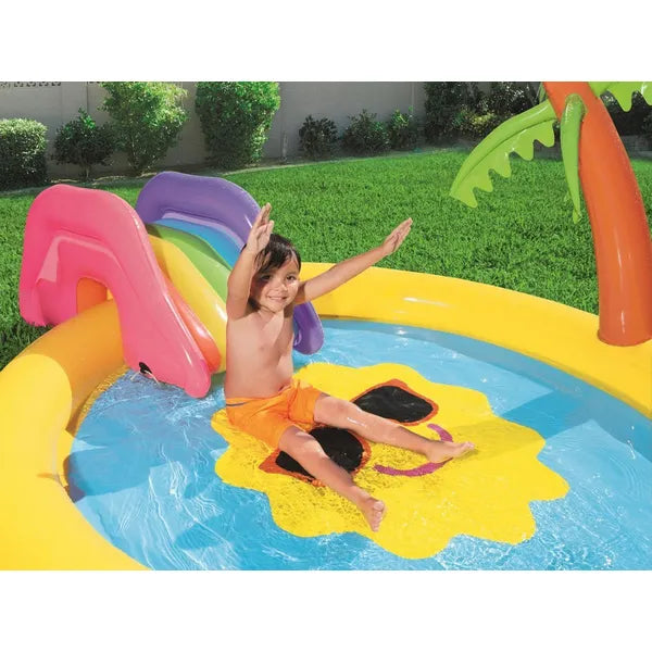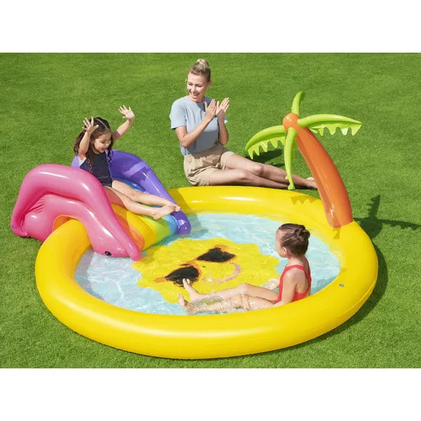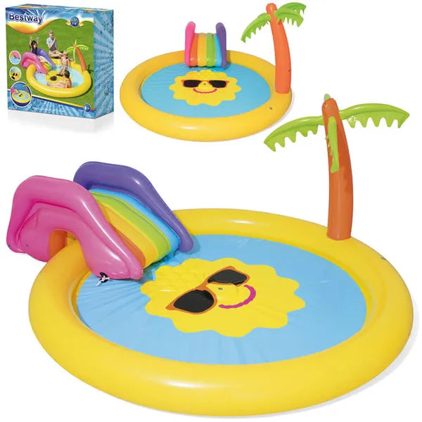 Ha vakáció, akkor vízi móka! A Bestway felfújható medencés játszótér szemet gyönyörködtető, napocskás grafikával hívja játékra a 3–6 éves gyerekeket. A puha, mégis erős vinilből készült medence 225 l vízzel tölthető, oldalán pedig könnyedén csatlakoztatható a kerti tömlő, hogy a beépített szökőkút hűsítő permetet biztosítson.
