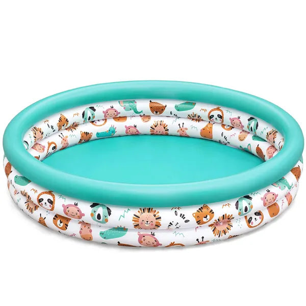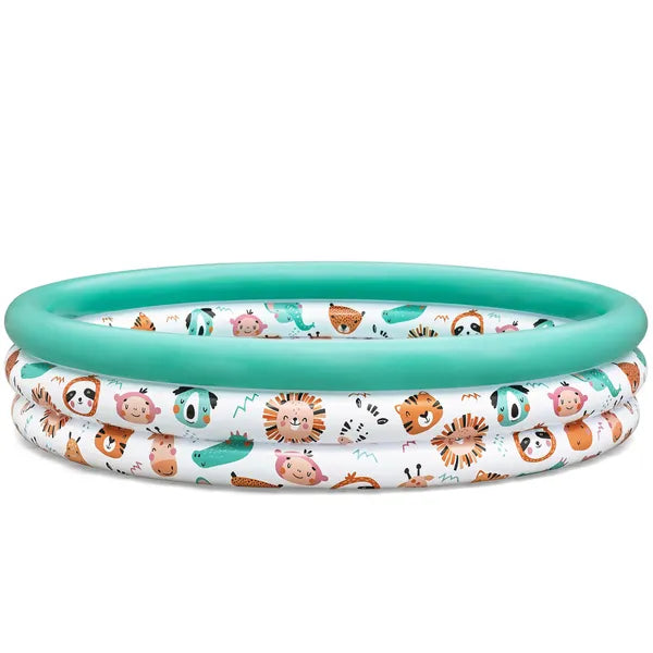 A Bestway Safari állatos felfújható gyermekmedence 122 cm átmérőjével és 25 cm falmagasságával gyorsan kedvenc pancsolóhelyévé válik a kisgyermekeknek. Három, külön szelepen át fújható légkamrája stabil tartást ad, a puha PVC oldalfalak pedig védik a lurkókat a horzsolásoktól.