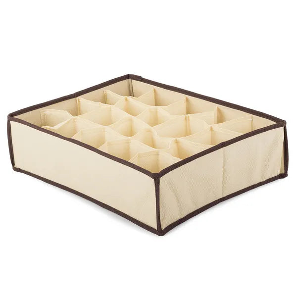 A bézs színű, 16 rekeszes fehérnemű- és zoknirendszerezővel rendet teremthet a fiókokban vagy a szekrény aljában. Légáteresztő textilből készült, oldalfalait merev karton erősíti, ezért használat közben nem rogyik össze.