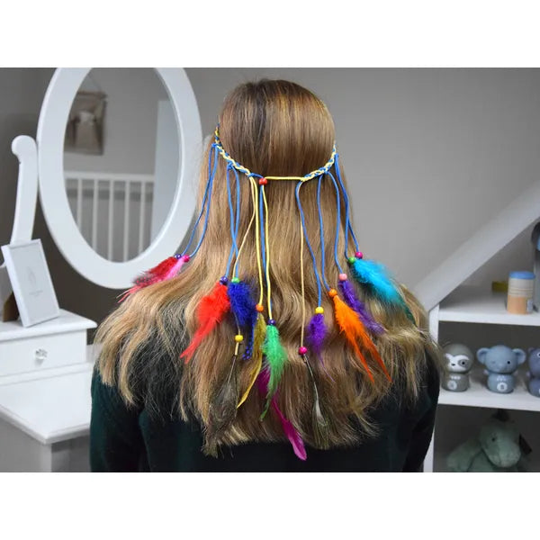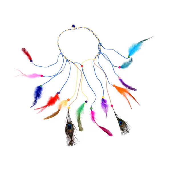 Mutasd meg szabad lelkedet ezzel a bohém fejpánttal, amely szivárványszínű tollakból, natúr fa gyöngyökből és vékony fonatokból áll. A könnyű, puha alap kényelmesen simul a fejre, a csúszócsat pedig lehetővé teszi, hogy a pánt körméretét igényeidhez igazítsd.