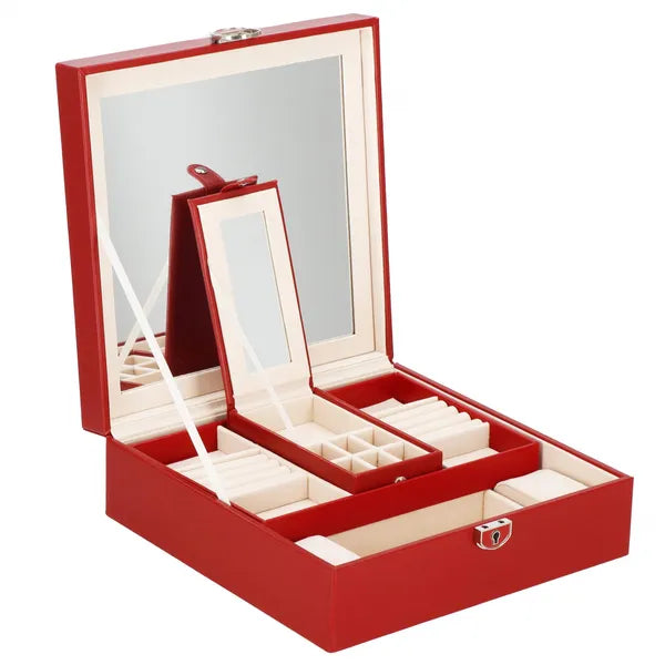 - 2 szintes kialakítás kivehető felső tálcával a gyűrűknek, fülbevalóknak és karkötőknek