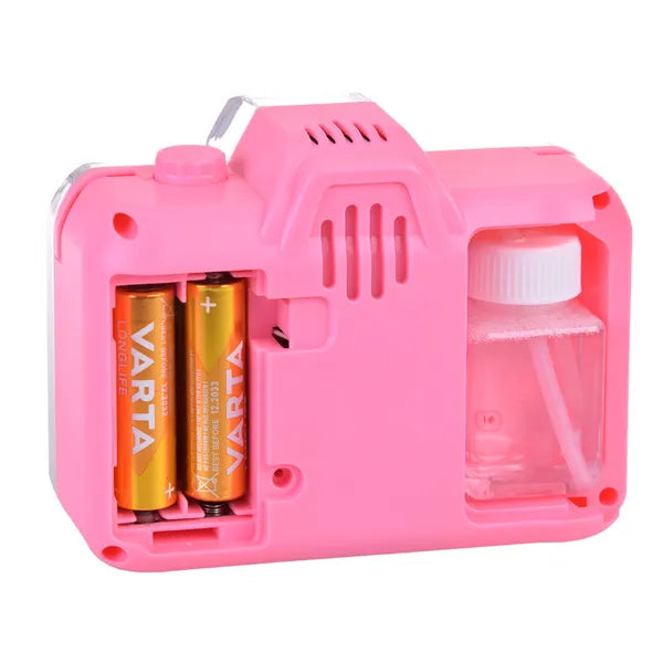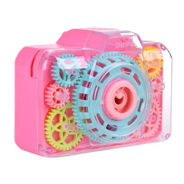 Szappanbuborékokat eregető, fény- és hanghatású játékkamera, amely minden gombnyomásra „kattan”, felvillan és színes buborékfelhőt bocsát ki. A forgó áttetsző fogaskerekek látványa még izgalmasabbá teszi a játékot, miközben a gyermek finommotorikája, érzékszervei és fantáziája is fejlődik.