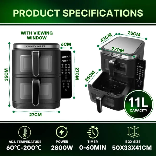 Comfy Nest 11 l dupla kosaras forrólevegős sütő ablakos, 2800 W