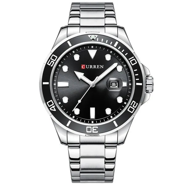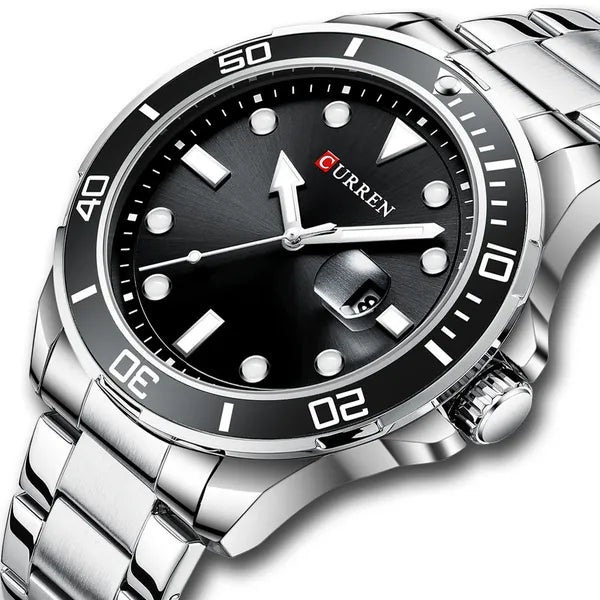 Curren 8388 férfi karóra, ezüst acél szíj, fekete számlap, WR30