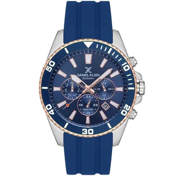 A Daniel Klein 12837-3 férfi karóra modern megjelenésével és megbízható japán MIYOTA kvarc szerkezetével tökéletes választás a mindennapokra és a sportos alkalmakra egyaránt. A sötétkék szilikon szíj és a tengerészkék számlap kontrasztos rózsaarany-fehér indexei markáns, mégis elegáns összhatást biztosítanak.
