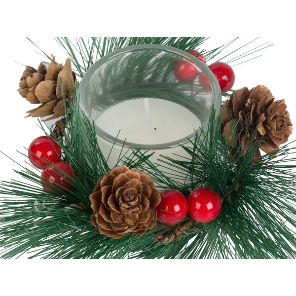 Dekoratív üveg mécsestartó fenyőkoszorúval, karácsonyi szett 2 db