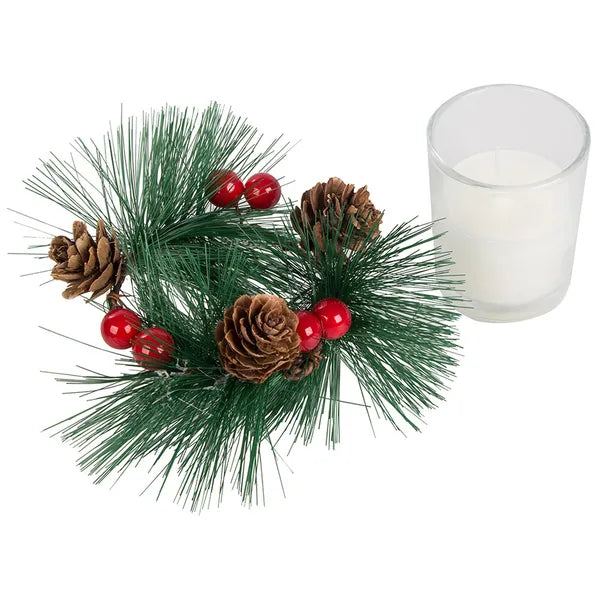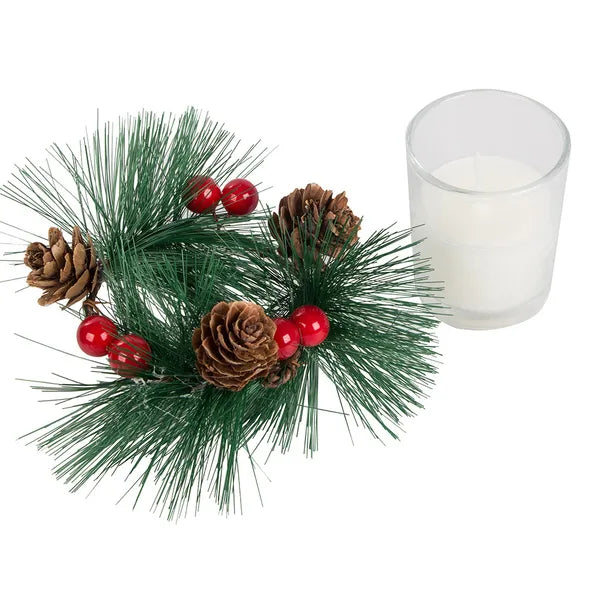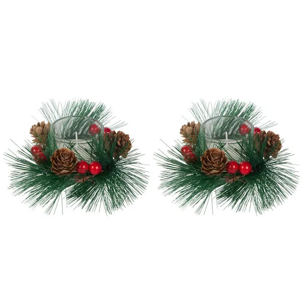 - 2 × dekoratív üveg mécsestartó fenyőkoszorúval