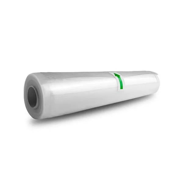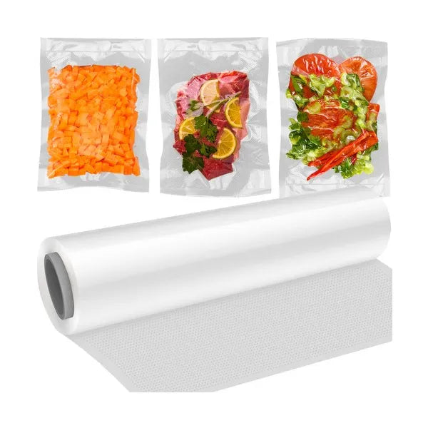 Otthoni és professzionális vákuumfólia-hegesztőgépekhez készült, 28 cm széles és 6 m hosszú, dombornyomott vákuumfólia tekercs, amely segít az élelmiszerek frissességének megőrzésében és helytakarékos tárolásában.