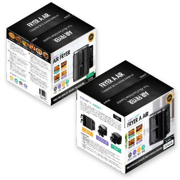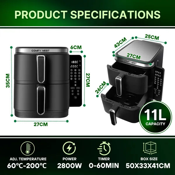A 2800 W teljesítményű, 11 literes, dupla kosaras légsütővel gyorsan és egészségesen varázsolhatod az asztalra a főételt és a köretet is. Két, egyenként 5,5 l űrtartalmú rekesze külön hőmérséklet- és időszabályzással rendelkezik, így egyszerre két fogást süthetsz tökéletesre. A Rapid Air technológia forró levegővel, minimális olaj felhasználásával biztosít ropogós állagot, miközben akár 80 %-kal kevesebb zsiradékot igényel.