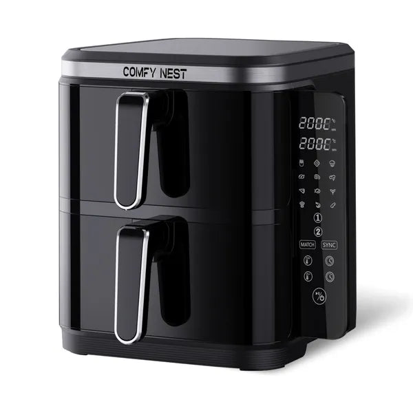 - Független dupla kosár – két különálló fiók 80–200 °C tartományban, 0–60 perc időzítővel.
