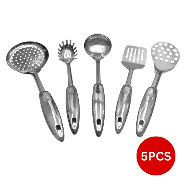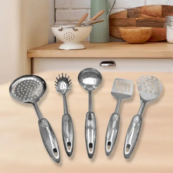 Egészítse ki konyháját ezzel az öt részes, rozsdamentes acél eszközkészlettel, amely a mindennapi főzéshez és tálaláshoz kínál strapabíró, mégis elegáns megoldást. A tükörfényes felület nem fogja be a foltokat, az ergonomikus, kampóval ellátott nyél pedig helytakarékos tárolást tesz lehetővé.
