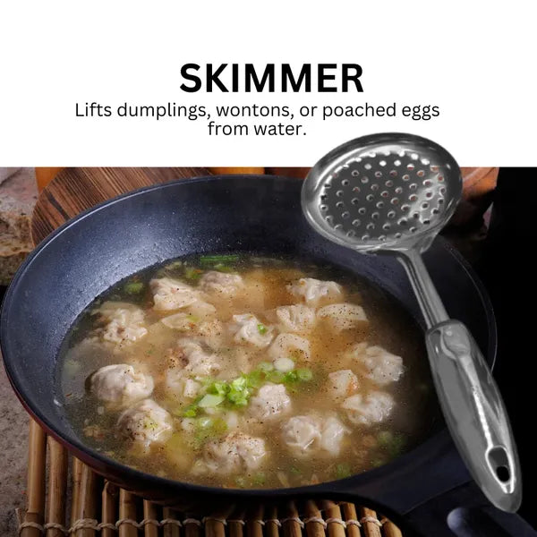 - 5 eszköz: habszedő, lyukacsos lapát, merőkanál, spagettiszedő, krumplinyomó