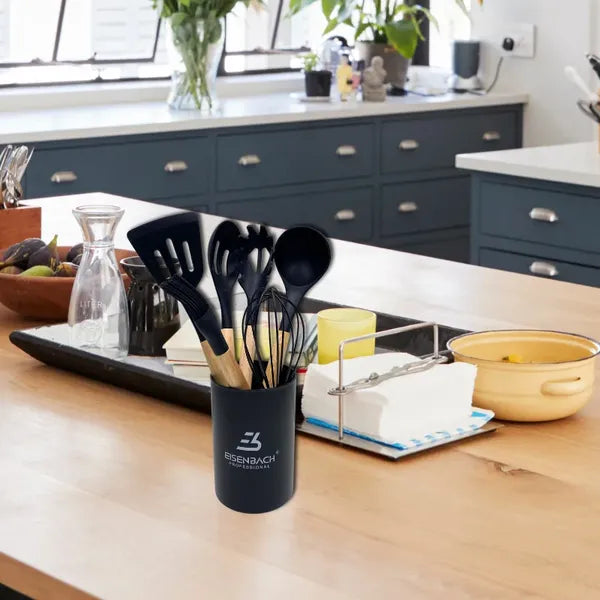 A Eisenbach 7 darabos szilikon–fa konyhai eszközkészlet stílusos és praktikus segítőtárs minden főzésnél. A hőálló (-30 °C-tól +190 °C-ig) szilikon nylon fejek nem karcolják a tapadásmentes edényeket, a fa mintás, puha tapintású nyél pedig biztos fogást ad. Az emelt fejű kialakításnak köszönhetően az eszközök nem érnek a munkalaphoz, így a pult tiszta és higiénikus marad.