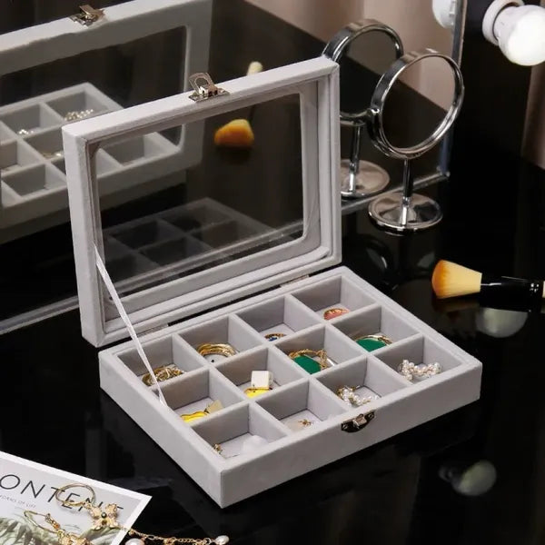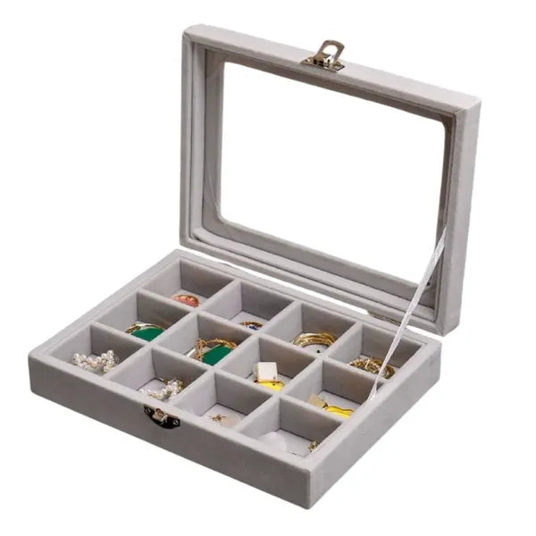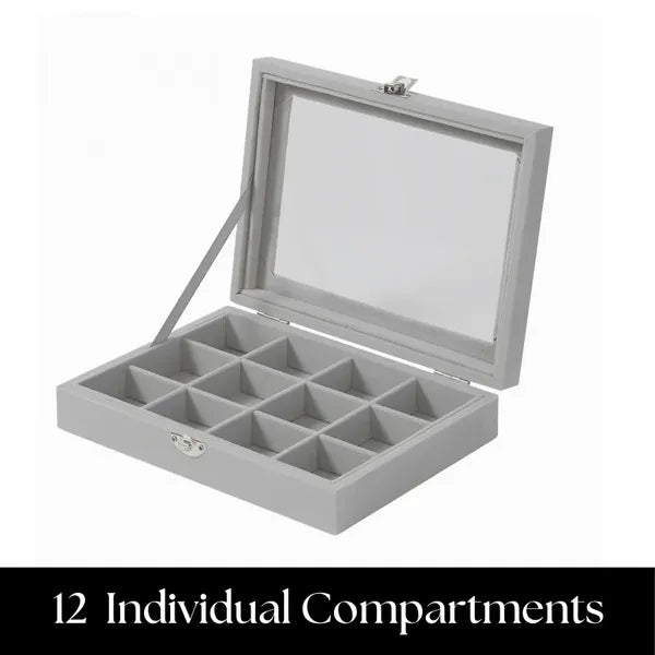 Szereted, ha kedvenc ékszereid átláthatóan elérhetők és biztonságban pihennek? Ez a kompakt, üvegfedeles ékszerdoboz 12 különálló rekesszel gondoskodik róla, hogy gyűrűid, fülbevalóid, karkötőid és láncaid rendezetten, karcolások nélkül várjanak rád.