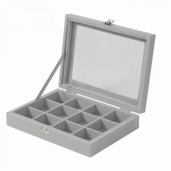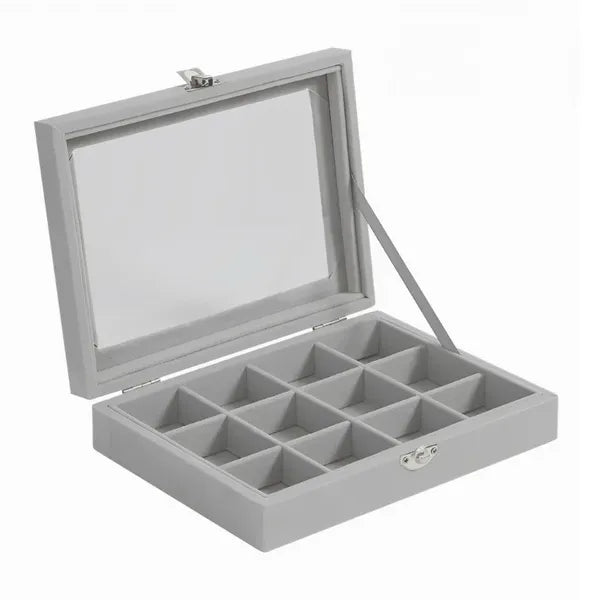 Ékszerdoboz üvegfedéllel, 12 rekesszel, 20×15×5 cm, szürke