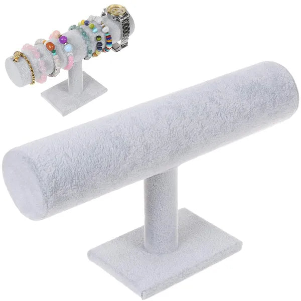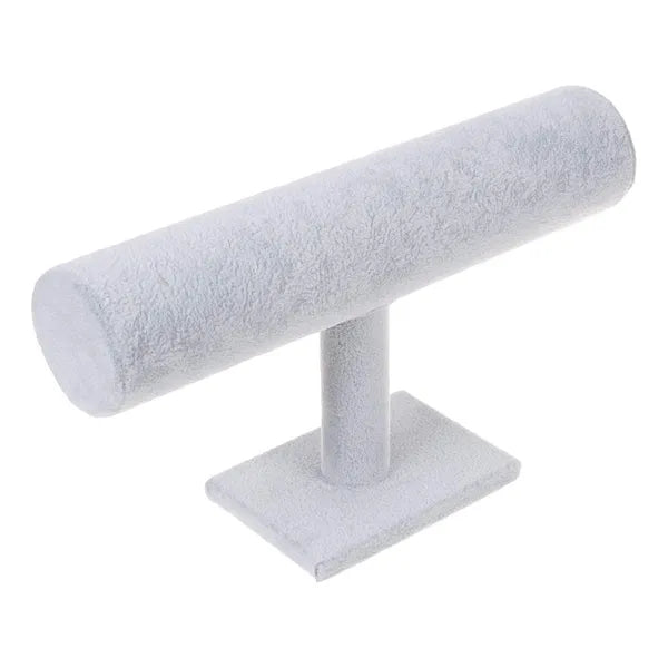 Kiemelkedő megjelenésű, szürke velúrborítású ékszertartó állvány, amelynek hengere 24 cm széles, 5 cm átmérőjű és az egész szerkezet mindössze 14 cm magas. Ideális órák, karkötők vagy egyéb ékszerek ízléses rendszerezéséhez otthon, valamint látványos bemutatásához kirakatban, vásárokon.