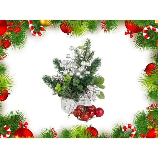 Ünnepeld a karácsonyt stílusosan ezzel az ezüst asztali dekorációval, amely 23 cm magas, 8 cm átmérőjű talpán stabilan áll. A finom ezüst gömbök és díszek, valamint a csillogó textilszalag elegáns, télies hangulatot kölcsönöznek a nappaliban, étkezőben vagy akár az irodai íróasztalon.
