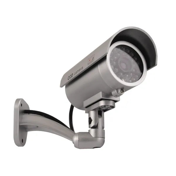 Ezüst csőkamera-atrapa IR LED-del, villogó piros dióda, kültéri-beltéri